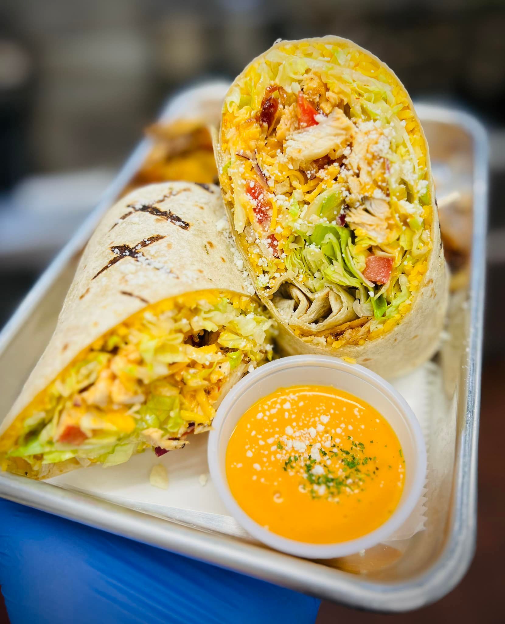Seasoned Beef & Chorizo, Seasoned Pulled Chicken, Spanish Style Rice, Fiesta Beans, Queso Cheese Dip, Fried Yellow Corn Tortilla Chips, Shredded Lettuce, Cheddar-Jack Cheese, Salsa Verde, Pico de Gallo, Flour Street Taco Shells